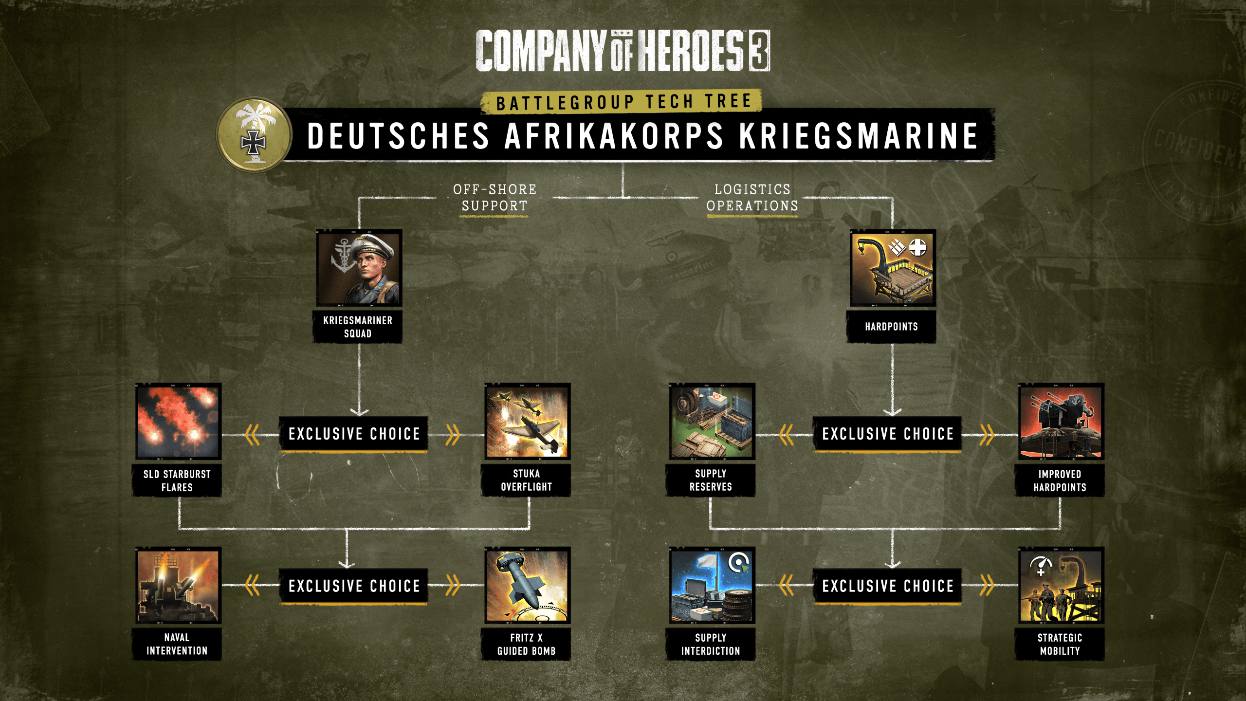 کریگزمارین از یونیتهای جدید بازی است که با استقبال خوب بازیکنان روبهرو شد. آفریکا کورپس در بازی با این بتلگروپ، قویتر از هر زمان دیگری شده است. قدرت رزمی کریگزمارین بهشدت بالاست و اگر در تعداد بالا از آنها استفاده کنید، بهراحتی میتوانند پیادهنظام متفقین را درهم بشکنند. مهمترین ویژگی این بتلگروپ، امکان ساخت hardpoint با کریگزمارین است که به شما منابع میدهد، نیروهای اطراف را تقویت میکند و میشود از آن بهعنوان یک پایه دفاعی هم استفاده کرد. شما میتوانید یا روی آن یک AA قدرتمند کار بگذارید، یا نیروهایتان را داخل آن قرار دهید تا در پناهگاه خوبی برای شلیک باشند. شاخه دیگر کریگزمارین بیشتر به بمباران و نیروی هوایی و اشتوکا محدود شده که از این نظر هم این بتلگروپ را بهشدت برای متفقین خطرناک کرده است.